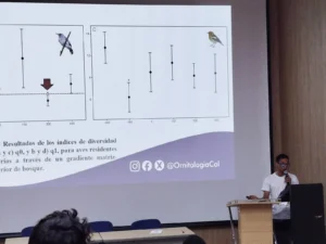• Issac Daniel Díaz presentó un trabajo enfocado en aves migratorias, desarrollado gracias a las Becas de Aves Migratorias en la Reserva ProAves El Dorado, destacando la importancia de estos sitios para la conservación de especies que recorren grandes distancias.