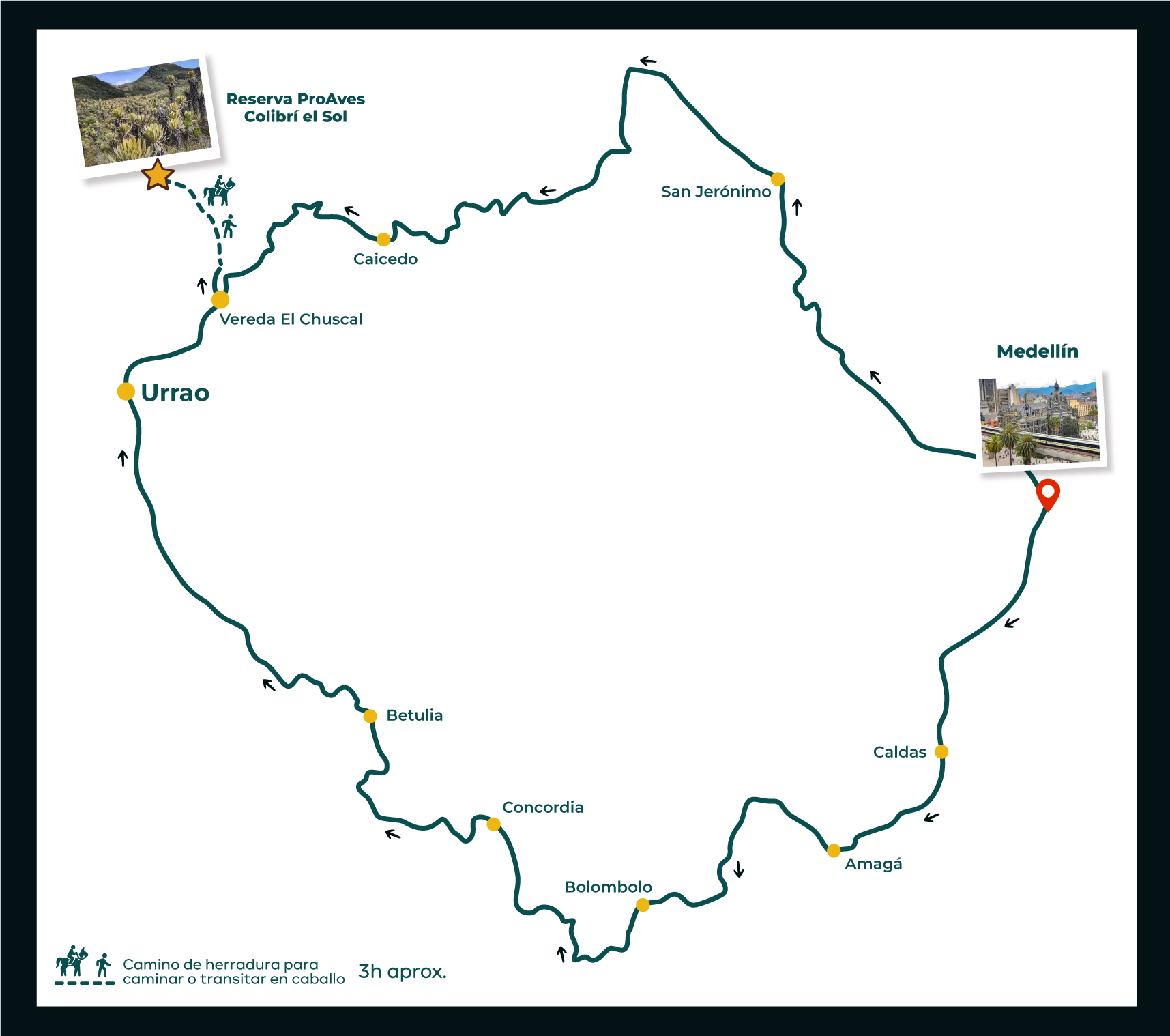 Medellín – Itagüí – La Estrella – Caldas – Amagá – Bolombolo – Concordia – Betulia – Urrao.